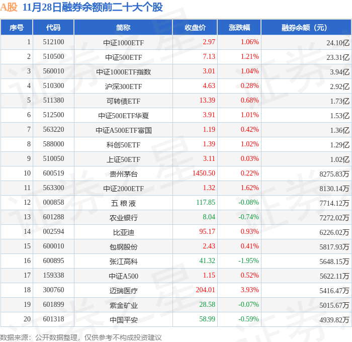 A股融券余额前三分别为:中证1000ETF(512100)融券余额24.1亿元、中证500ETF(510500)融券余额23.31亿元、中证1000ETF指数(560010)融券余额3.94亿元,前20具体见下表: