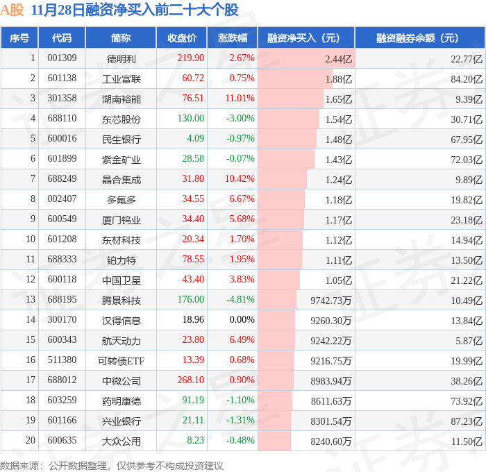 A股融资净买入前三分别为:德明利(001309)融资净买入2.44亿元、工业富联(601138)融资净买入1.88亿元、湖南裕能(301358)融资净买入1.65亿元,前20具体见下表: