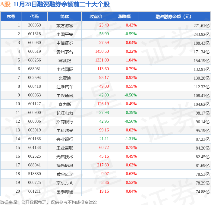 A股融资融券余额前三分别为:东方财富(300059)融资融券余额271.61亿元、中国平安(601318)融资融券余额243.92亿元、中信证券(600030)融资融券余额188.43亿元,前20具体见下表: