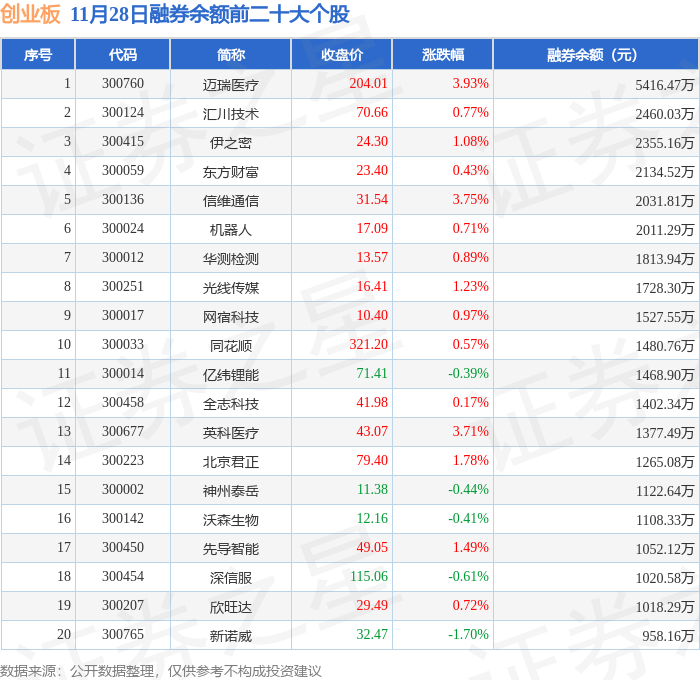 创业板融券余额前三分别为:迈瑞医疗(300760)融券余额5416.47万元、汇川技术(300124)融券余额2460.03万元、伊之密(300415)融券余额2355.16万元,前20具体见下表: