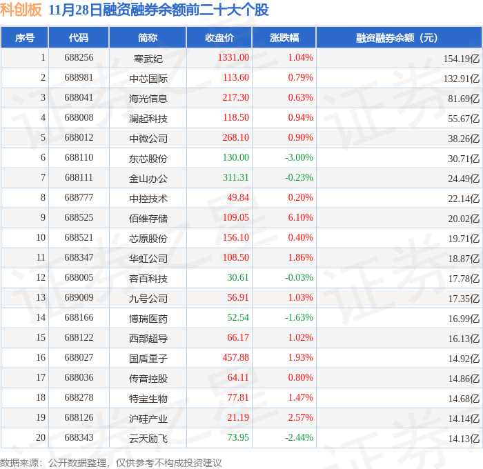 科创板融资融券余额前三分别为:寒武纪(688256)融资融券余额154.19亿元、中芯国际(688981)融资融券余额132.91亿元、海光信息(688041)融资融券余额81.69亿元,前20具体见下表: