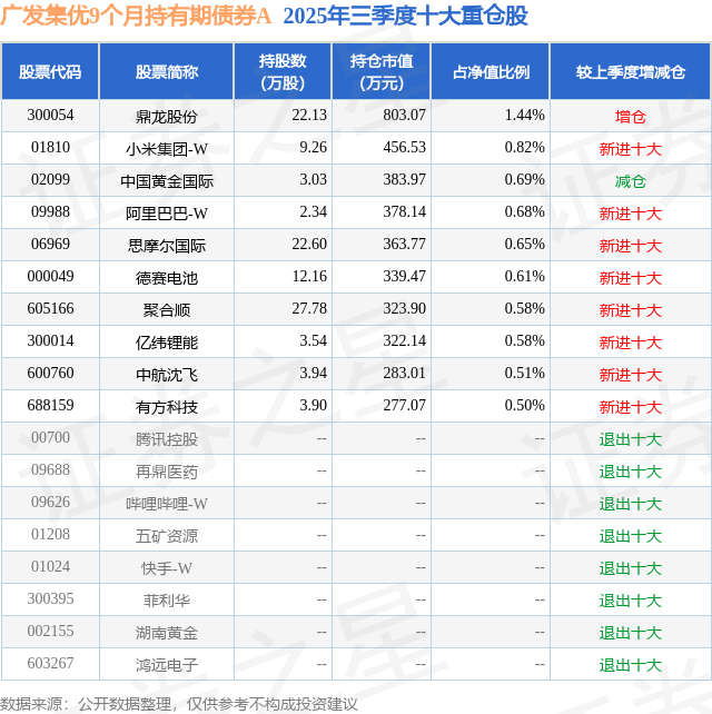 广发集优9个月持有期债券A的前十大重仓股如下: