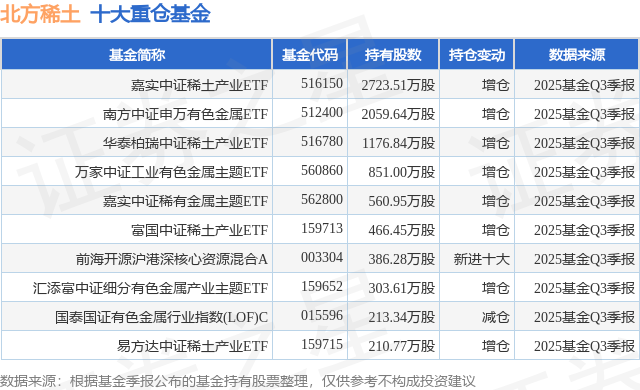 根据2025基金Q3季报公募基金重仓股数据,重仓该股的公募基金共47家,其中持有数量最多的公募基金为嘉实基金的嘉实中证稀土产业ETF。嘉实中证稀土产业ETF目前规模为76.48亿元,最新净值1.7066(11月28日),较上一交易日上涨1.77%,近一年上涨59.09%。该公募基金现任基金经理为田光远。田光远在任的基金产品包括:嘉实中证软件服务ETF,管理时间为2021年6月4日至今,期间收益率为-17.19%;嘉实中证电池主题ETF,管理时间为2021年7月13日至今,期间收益率为-15.73%;嘉实中证稀土产业ETF联接A,管理时间为2021年8月3日至今,期间收益率为18.34%。