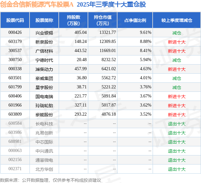 根据2025基金Q3季报公募基金重仓股数据,重仓该股的公募基金共1家,其中持有数量最多的公募基金为创金合信基金的创金合信新能源汽车股票A。创金合信新能源汽车股票A目前规模为7.0亿元,最新净值1.8617(11月28日),较上一交易日上涨0.91%,近一年上涨15.05%。该公募基金现任基金经理为曹春林。
