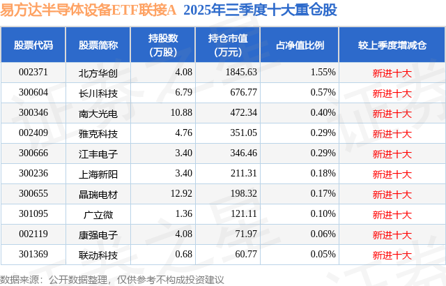 根据2025基金Q3季报公募基金重仓股数据,重仓该股的公募基金共1家,其中持有数量最多的公募基金为易方达基金的易方达半导体设备ETF联接A。易方达半导体设备ETF联接A目前规模为2.42亿元,最新净值1.2722(11月28日),较上一交易日上涨2.14%,近一年上涨27.22%。该公募基金现任基金经理为李树建。李树建在任的基金产品包括:易方达创业板中盘200ETF,管理时间为2023年12月15日至今,期间收益率为41.04%;易方达上证科创板成长ETF联接发起式A,管理时间为2024年1月4日至今,期间收益率为98.13%;易方达信创ETF联接A,管理时间为2024年1月5日至今,期间收益率为76.78%;易方达机器人ETF联接A,管理时间为2024年5月21日至今,期间收益率为39.17%。