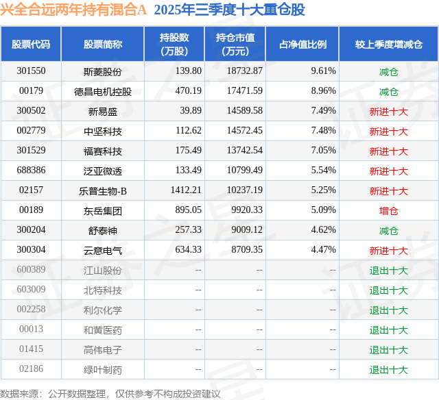 根据2025基金Q3季报公募基金重仓股数据,重仓该股的公募基金共2家,其中持有数量最多的公募基金为兴证全球基金的兴全合远两年持有混合A。兴全合远两年持有混合A目前规模为18.68亿元,最新净值0.9012(11月28日),较上一交易日上涨1.49%,近一年上涨19.0%。该公募基金现任基金经理为吴钊华。