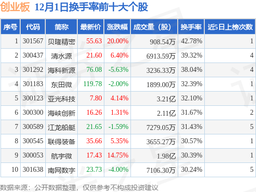 当日创业板换手率前10大个股中6只个股收涨,平均涨幅8.66%,其中贝隆精密(301567)以换手率42.78%排第一,5只个股近5个交易日中多次上榜。