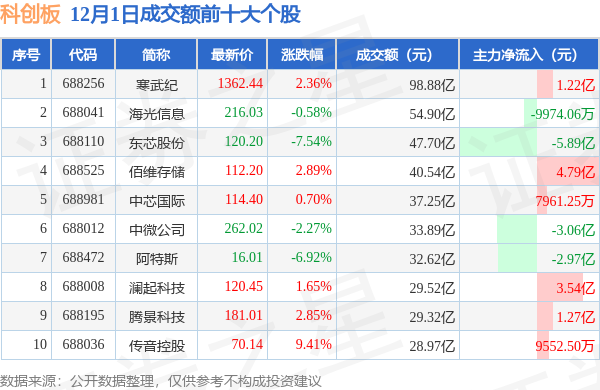 当日科创板成交额前10大个股中6只个股收涨,平均涨幅3.31%,其中寒武纪(688256)以成交额98.88亿元排第一。从主力资金流入看,成交额前10大个股中有6只个股呈现主力资金净流入。