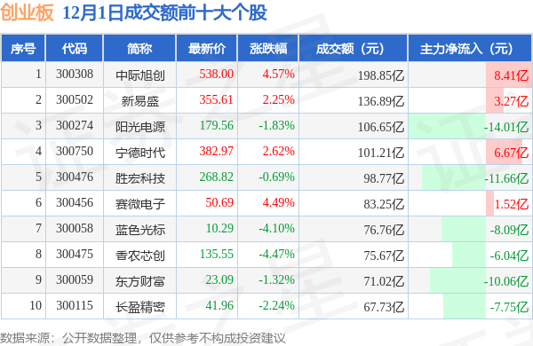 当日创业板成交额前10大个股中4只个股收涨,平均涨幅3.48%,其中中际旭创(300308)以成交额198.85亿元排第一。从主力资金流入看,成交额前10大个股中有4只个股呈现主力资金净流入。