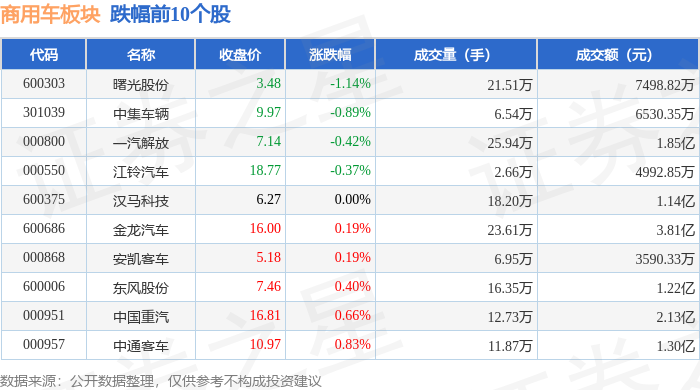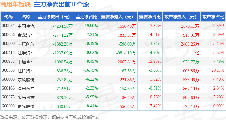 从资金流向上来看,当日商用车板块主力资金净流出1.55亿元,游资资金净流出4285.4万元,散户资金净流入1.98亿元。商用车板块个股资金流向见下表: