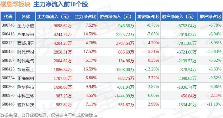 从资金流向上来看,当日磁悬浮板块主力资金净流出1.65亿元,游资资金净流入2.25亿元,散户资金净流出6091.56万元。磁悬浮板块个股资金流向见下表: