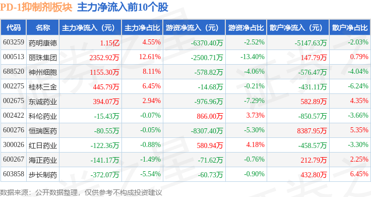 从资金流向上来看,当日PD-1抑制剂板块主力资金净流出1103.38万元,游资资金净流出8917.27万元,散户资金净流入1.0亿元。PD-1抑制剂板块个股资金流向见下表: