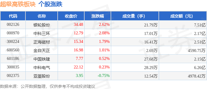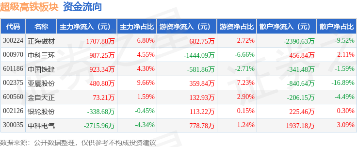 从资金流向上来看,当日超级高铁板块主力资金净流入1117.84万元,游资资金净流入41.57万元,散户资金净流出1159.41万元。超级高铁板块个股资金流向见下表: