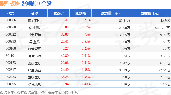 证券之星消息,12月1日眼科板块较上一交易日上涨0.19%,莱美药业领涨。当日上证指数报收于3914.01,上涨0.65%。深证成指报收于13146.72,上涨1.25%。眼科板块个股涨跌见下表: