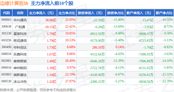 从资金流向上来看,当日边缘计算板块主力资金净流入60.09亿元,游资资金净流出34.23亿元,散户资金净流出25.86亿元。边缘计算板块个股资金流向见下表: