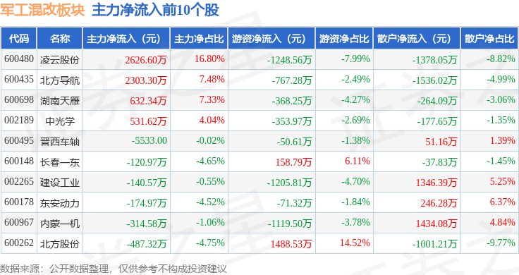 从资金流向上来看,当日军工混改板块主力资金净流出4.21亿元,游资资金净流出6390.03万元,散户资金净流入4.84亿元。军工混改板块个股资金流向见下表: