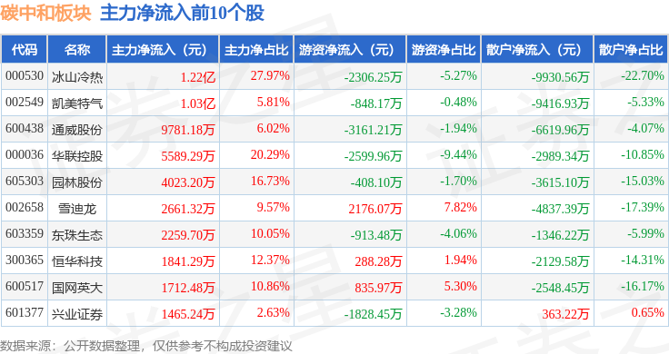 从资金流向上来看,当日碳中和板块主力资金净流出18.28亿元,游资资金净流入5.55亿元,散户资金净流入12.73亿元。碳中和板块个股资金流向见下表: