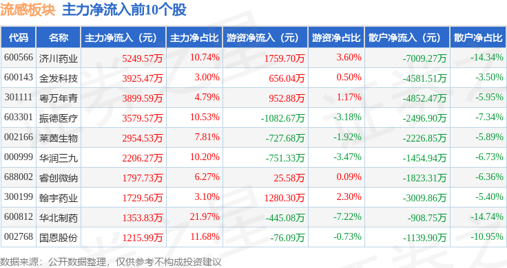 从资金流向上来看,当日流感板块主力资金净流出4.66亿元,游资资金净流入3.23亿元,散户资金净流入1.43亿元。流感板块个股资金流向见下表: