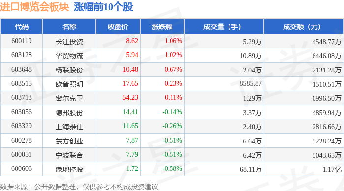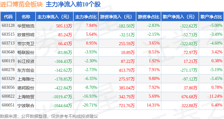 从资金流向上来看,当日进口博览会板块主力资金净流出8607.45万元,游资资金净流入2960.6万元,散户资金净流入5646.85万元。进口博览会板块个股资金流向见下表: