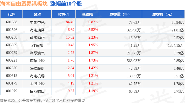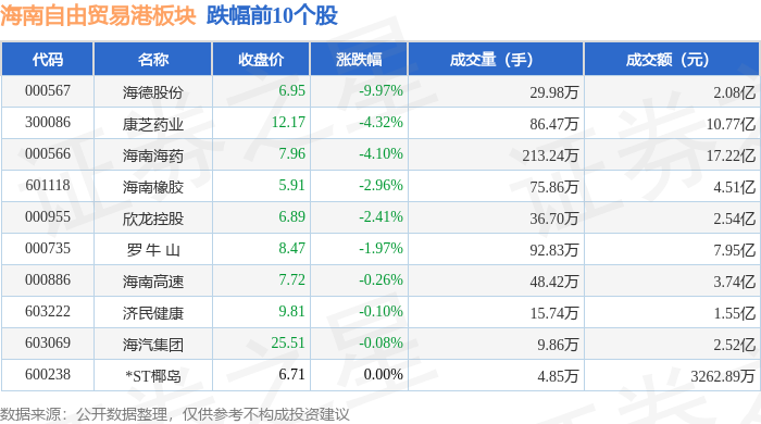 从资金流向上来看,当日海南自由贸易港板块主力资金净流出1.62亿元,游资资金净流入3.44亿元,散户资金净流出1.82亿元。海南自由贸易港板块个股资金流向见下表: