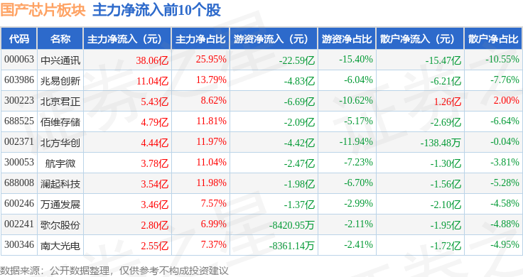 从资金流向上来看,当日国产芯片板块主力资金净流入61.53亿元,游资资金净流出39.64亿元,散户资金净流出21.89亿元。国产芯片板块个股资金流向见下表: