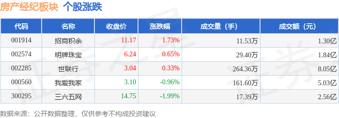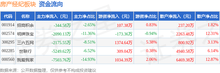 从资金流向上来看,当日房产经纪板块主力资金净流出1.74亿元,游资资金净流入2652.09万元,散户资金净流入1.47亿元。房产经纪板块个股资金流向见下表: