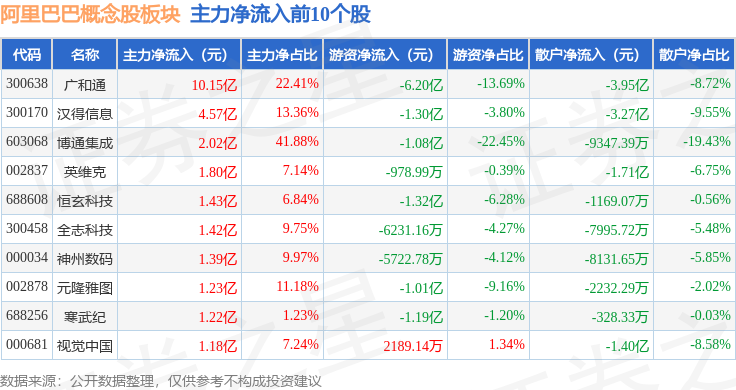 从资金流向上来看,当日阿里巴巴概念股板块主力资金净流出7.8亿元,游资资金净流出6.17亿元,散户资金净流入13.97亿元。阿里巴巴概念股板块个股资金流向见下表: