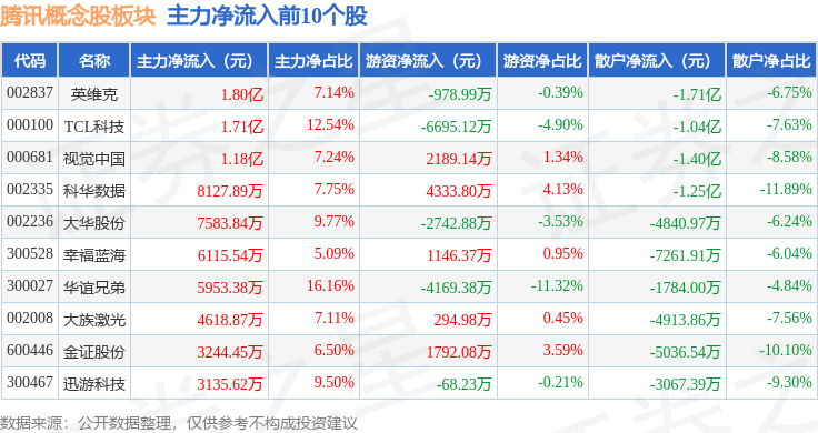 从资金流向上来看,当日腾讯概念股板块主力资金净流出3.79亿元,游资资金净流入1.2亿元,散户资金净流入2.59亿元。腾讯概念股板块个股资金流向见下表: