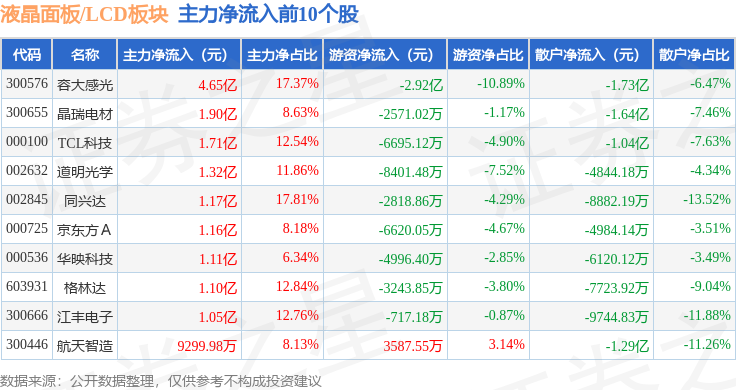 从资金流向上来看,当日液晶面板/LCD板块主力资金净流入10.13亿元,游资资金净流出5.65亿元,散户资金净流出4.48亿元。液晶面板/LCD板块个股资金流向见下表: