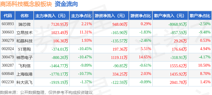从资金流向上来看,当日商汤科技概念股板块主力资金净流入1922.41万元,游资资金净流入2083.8万元,散户资金净流出4006.22万元。商汤科技概念股板块个股资金流向见下表:
