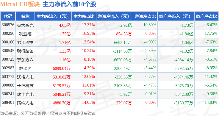 从资金流向上来看,当日MicroLED板块主力资金净流入3.51亿元,游资资金净流入5401.95万元,散户资金净流出4.05亿元。MicroLED板块个股资金流向见下表: