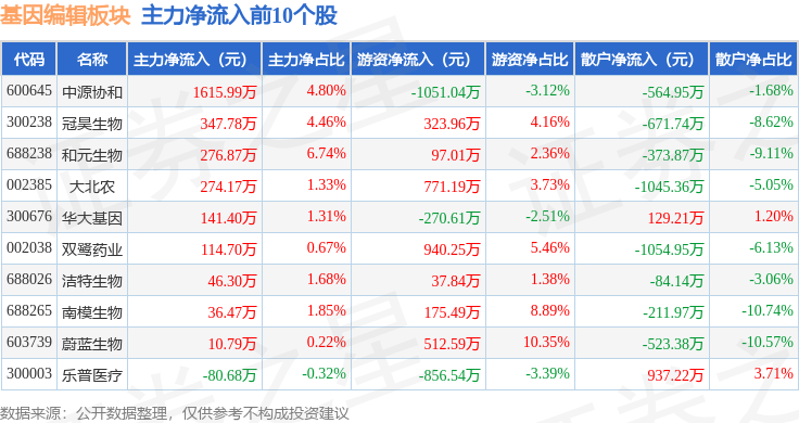 从资金流向上来看,当日基因编辑板块主力资金净流出1.95亿元,游资资金净流入1.13亿元,散户资金净流入8286.76万元。基因编辑板块个股资金流向见下表: