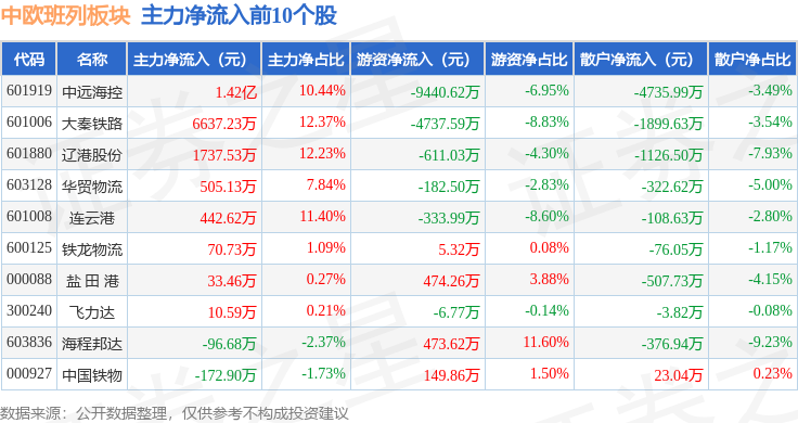 从资金流向上来看,当日中欧班列板块主力资金净流入4039.69万元,游资资金净流出3061.7万元,散户资金净流出977.99万元。中欧班列板块个股资金流向见下表: