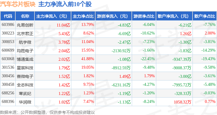 从资金流向上来看,当日汽车芯片板块主力资金净流入24.78亿元,游资资金净流出15.25亿元,散户资金净流出9.53亿元。汽车芯片板块个股资金流向见下表: