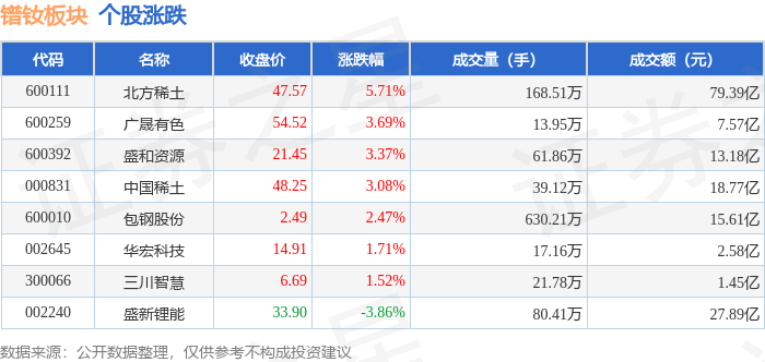 证券之星消息,12月1日镨钕板块较上一交易日上涨3.52%,北方稀土领涨。当日上证指数报收于3914.01,上涨0.65%。深证成指报收于13146.72,上涨1.25%。镨钕板块个股涨跌见下表: