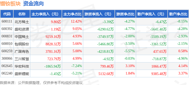 从资金流向上来看,当日镨钕板块主力资金净流入11.67亿元,游资资金净流出4.77亿元,散户资金净流出6.9亿元。镨钕板块个股资金流向见下表: