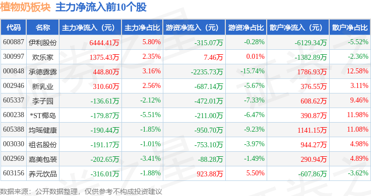 从资金流向上来看,当日植物奶板块主力资金净流出3522.2万元,游资资金净流出4123.62万元,散户资金净流入7645.82万元。植物奶板块个股资金流向见下表: