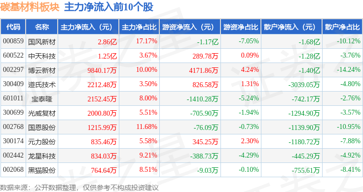 从资金流向上来看,当日碳基材料板块主力资金净流入4.15亿元,游资资金净流出1.02亿元,散户资金净流出3.13亿元。碳基材料板块个股资金流向见下表: