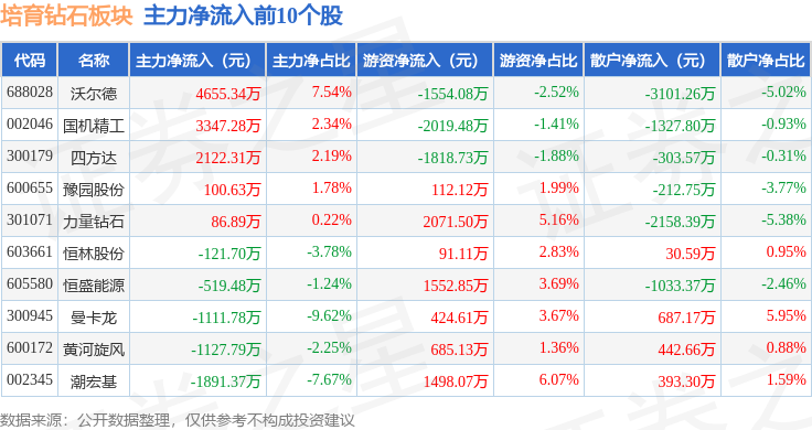从资金流向上来看,当日培育钻石板块主力资金净流出6201.35万元,游资资金净流入6242.36万元,散户资金净流出41.01万元。培育钻石板块个股资金流向见下表: