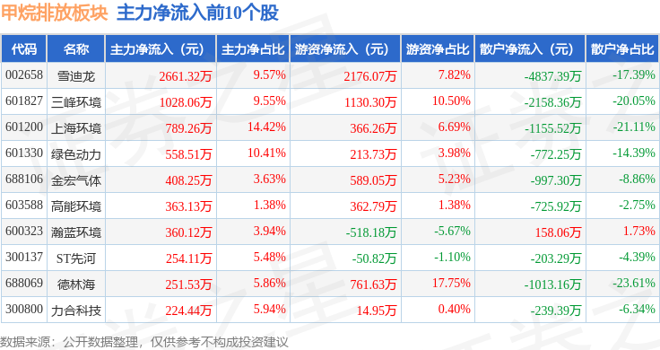 从资金流向上来看,当日甲烷排放板块主力资金净流出1741.79万元,游资资金净流入8374.96万元,散户资金净流出6633.16万元。甲烷排放板块个股资金流向见下表: