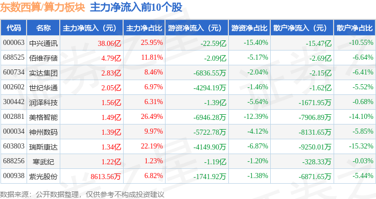 从资金流向上来看,当日东数西算/算力板块主力资金净流入28.23亿元,游资资金净流出23.79亿元,散户资金净流出4.44亿元。东数西算/算力板块个股资金流向见下表: