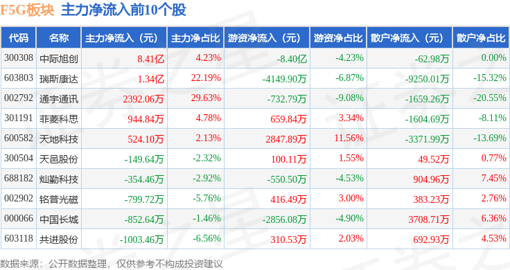 从资金流向上来看,当日F5G板块主力资金净流入805.21万元,游资资金净流出6.84亿元,散户资金净流入6.76亿元。F5G板块个股资金流向见下表: