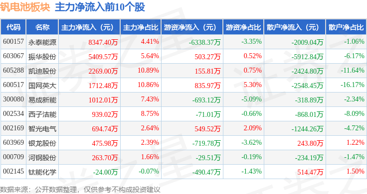 从资金流向上来看,当日钒电池板块主力资金净流出2.11亿元,游资资金净流入5839.89万元,散户资金净流入1.53亿元。钒电池板块个股资金流向见下表: