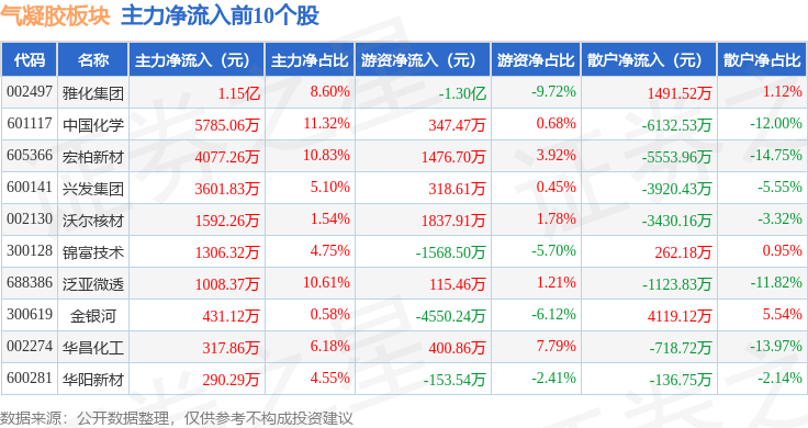 从资金流向上来看,当日气凝胶板块主力资金净流入2.1亿元,游资资金净流出1.51亿元,散户资金净流出5896.4万元。气凝胶板块个股资金流向见下表: