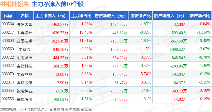 从资金流向上来看,当日供销社板块主力资金净流入1777.87万元,游资资金净流入400.05万元,散户资金净流出2177.91万元。供销社板块个股资金流向见下表: