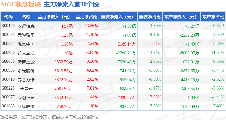 从资金流向上来看,当日AIGC概念板块主力资金净流出12.32亿元,游资资金净流出7924.84万元,散户资金净流入13.11亿元。AIGC概念板块个股资金流向见下表: