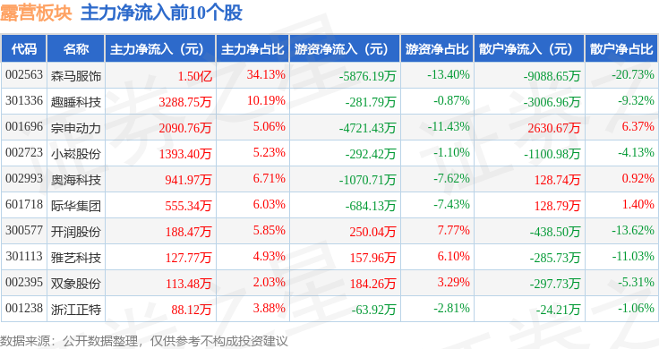 从资金流向上来看,当日露营板块主力资金净流出5739.52万元,游资资金净流出3162.34万元,散户资金净流入8901.85万元。露营板块个股资金流向见下表: