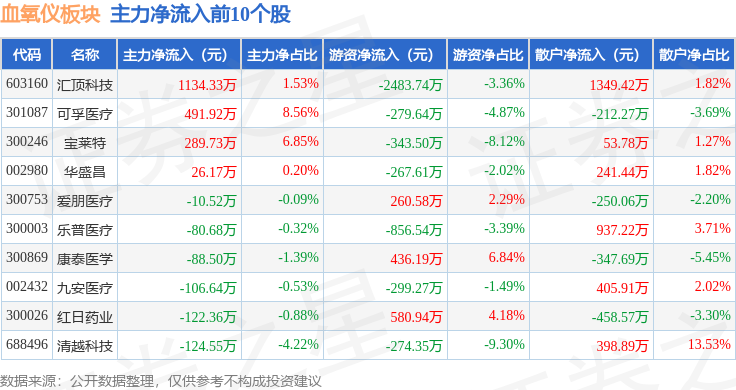 从资金流向上来看,当日血氧仪板块主力资金净流出1151.33万元,游资资金净流出874.85万元,散户资金净流入2026.18万元。血氧仪板块个股资金流向见下表: