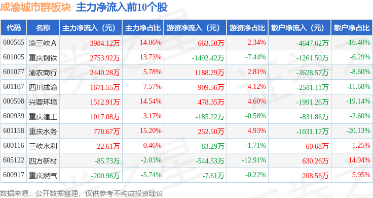 从资金流向上来看,当日成渝城市群板块主力资金净流出4511.45万元,游资资金净流入6666.1万元,散户资金净流出2154.65万元。成渝城市群板块个股资金流向见下表:
