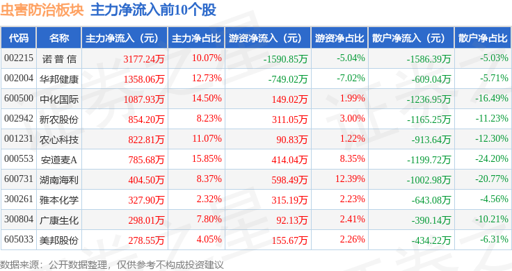 从资金流向上来看,当日虫害防治板块主力资金净流入2362.24万元,游资资金净流入7033.29万元,散户资金净流出9395.53万元。虫害防治板块个股资金流向见下表:
